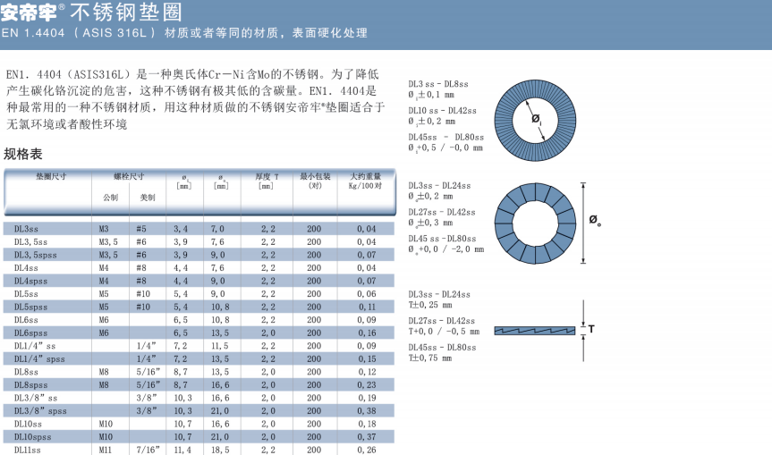 不銹鋼墊圈(EN 1.4404 / AISI 316L),DL3SS—DL42SS(標準尺寸)和DL45SS—DL80SS(根據要求定制)。